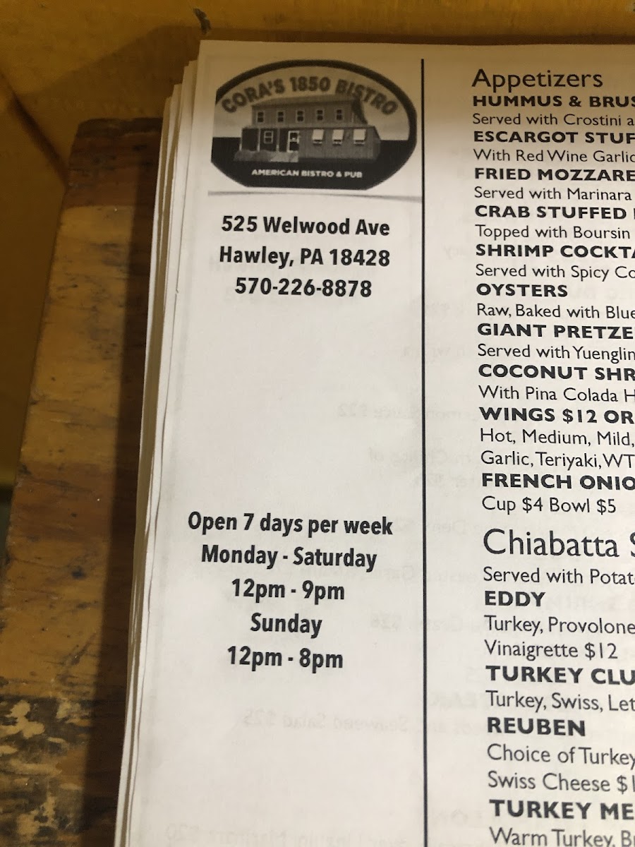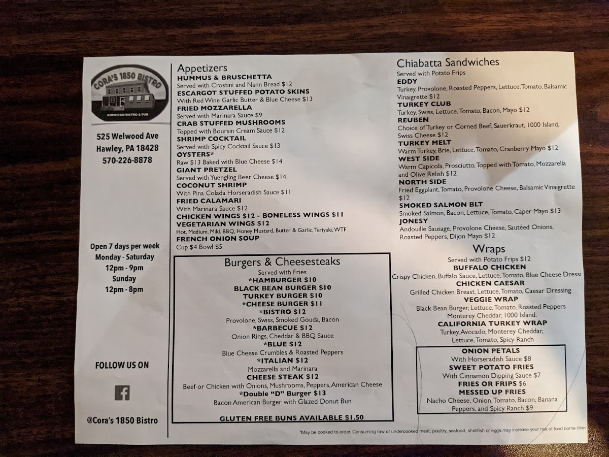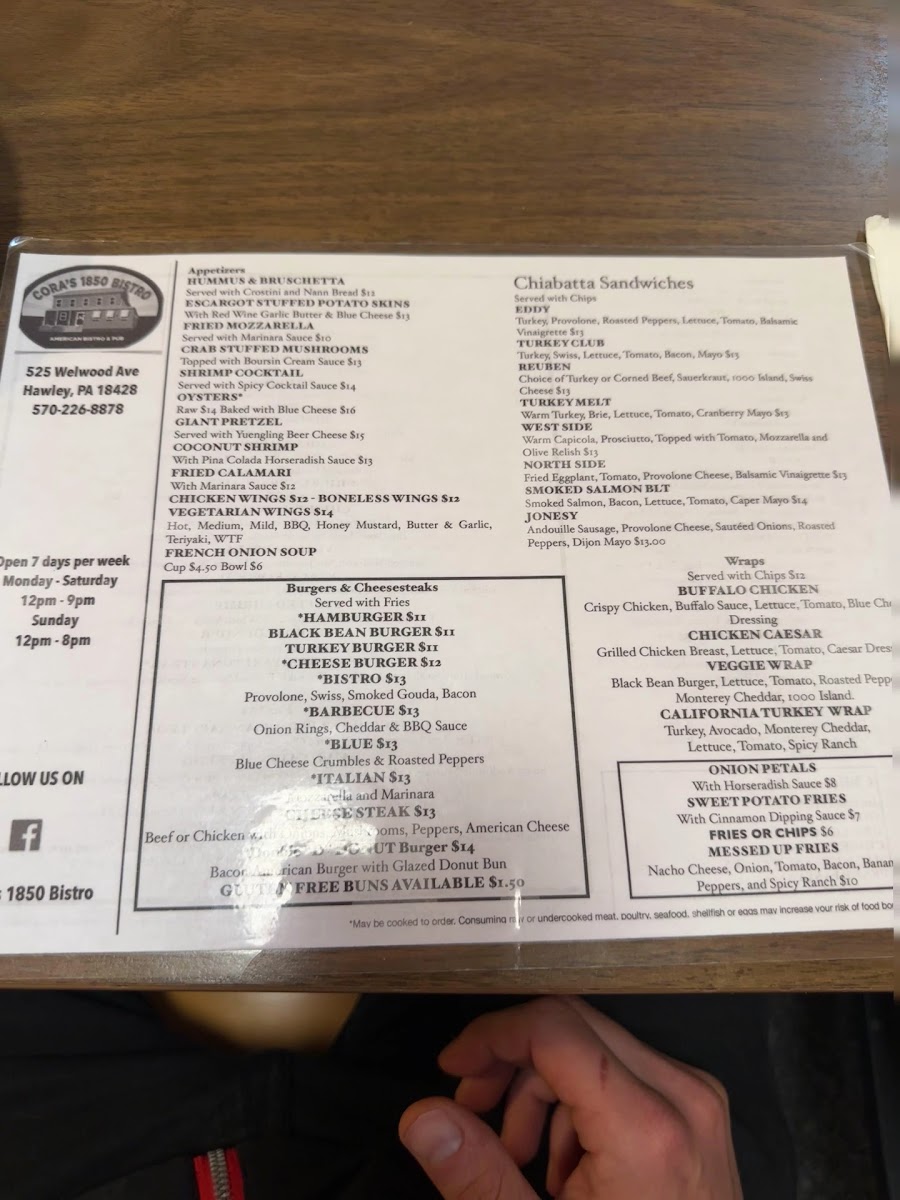 Nestled in the heart of Hawley, PA, Cora's 1850 Bistro tantalizes food lovers with a menu that reflects a blend of casual comfort and creative flair. This charming bistro serves up a diverse range of dishes, ensuring something for everyone. Guests rave about the Chicken and Waffles, a standout favorite, while the Smoked Salmon BLT delights with its rich flavors.